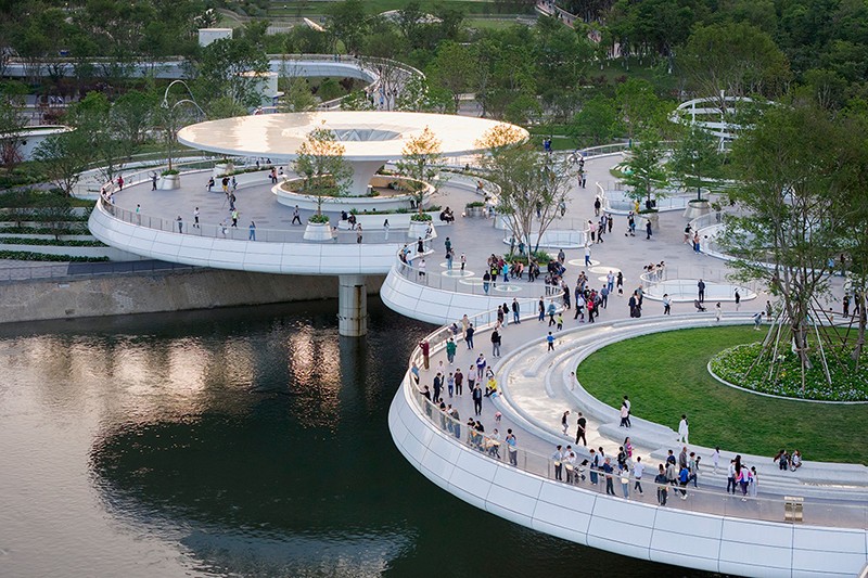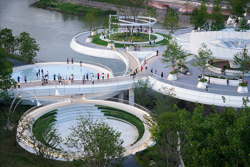 值得一提的是,橋上的 9 個圓盤單元雖大小各異,面積從 300 至 1600 平方米不等,但皆為同形異構(gòu)。圓盤之上精心栽種喬木,使之與河岸綠地綿延相連,仿若一座漂浮于錦江之上的空中公園。這 9 個圓盤單元既相互關(guān)聯(lián),構(gòu)成一個完整的景觀整體,又各自獨立,分化出 9 處風(fēng)格迥異、功能多樣的活動空間,全方位滿足市民休閑、娛樂、社交等多元需求。