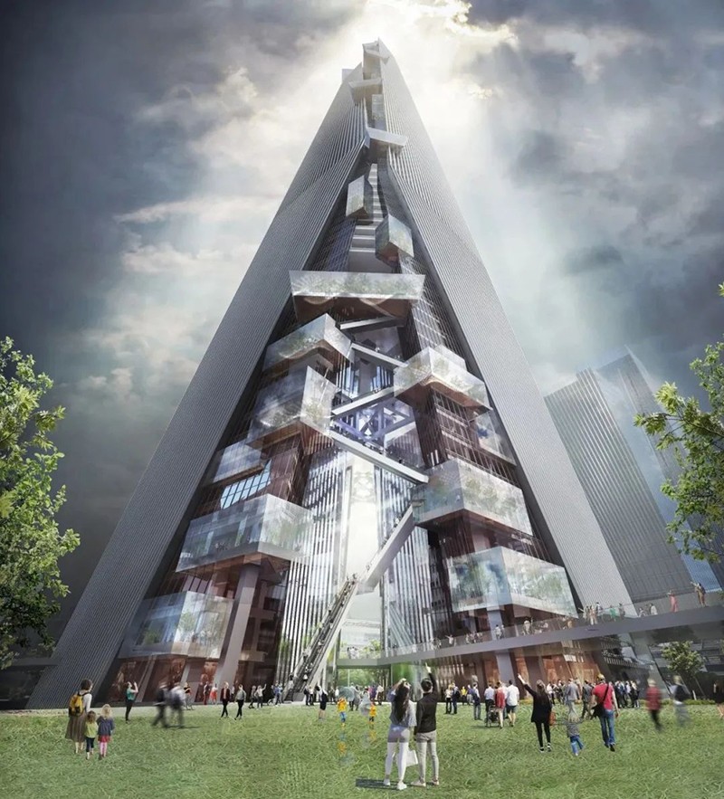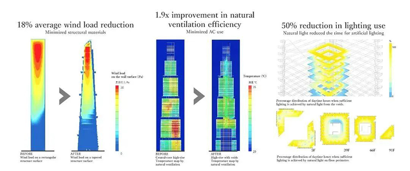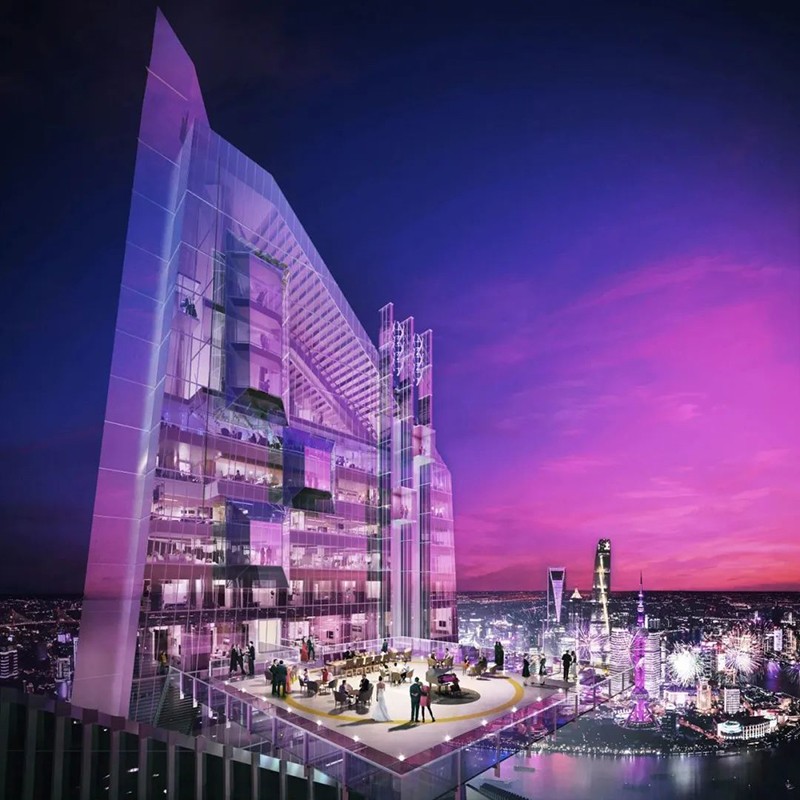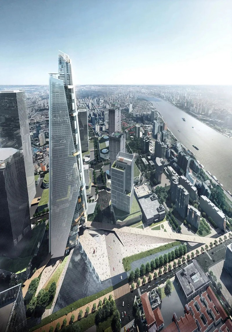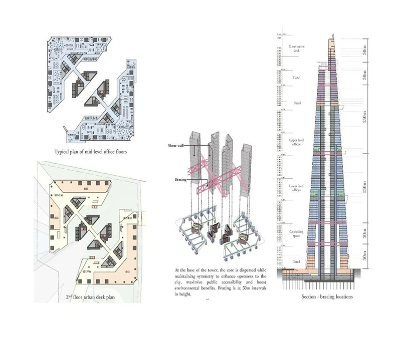 該建筑在50年內預計減少71萬噸CO2排放,相當于種植1620公頃森林。結構設計采用簡單的雙軸對稱平面,兩棟L形建筑在每隔50米或150米處連接。這個獨特的設計方案為超高層建筑帶來了新的公共空間形態(tài),成為上海未來城市發(fā)展的重要示范。