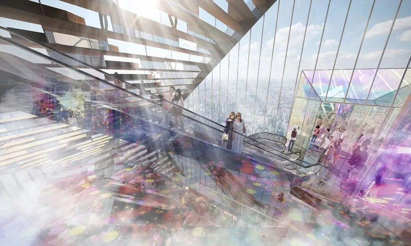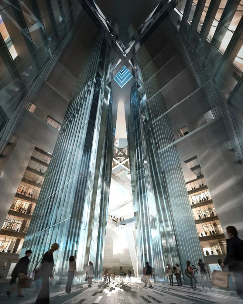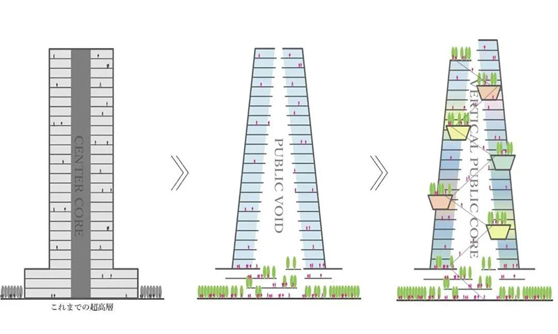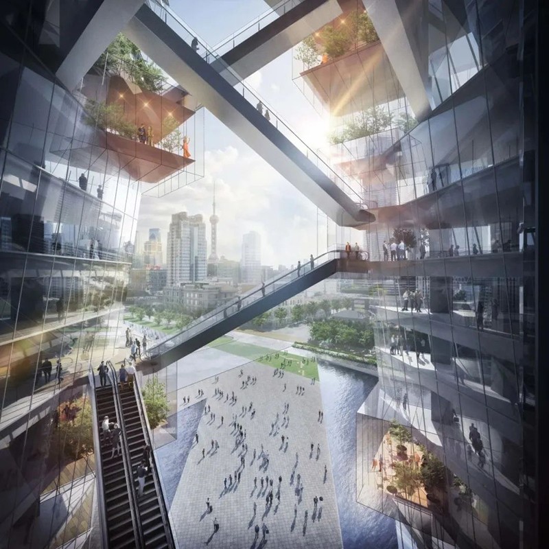 與傳統(tǒng)超高層建筑的封閉式設計不同,該項目在建筑中開設了一個巨大的孔洞“PUBLIC VOID”,將外部環(huán)境引入高層區(qū)域。通過這一設計,新增的外部公共空間面積達到2.1萬㎡,是用地面積的1.7倍,從物理層面擴展了城市公共空間。設計還通過自動扶梯連接PUBLIC VOID內的公共空間,實現立體移動,提升空間流動性和體驗感。