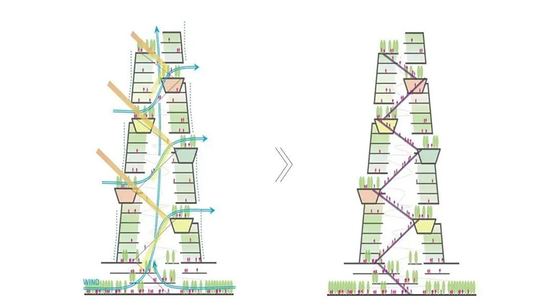 項目設計還專注于可持續(xù)性,建筑錐形外形可降低18%的風壓,同時減少結構框架的用量。環(huán)境模擬技術被用來優(yōu)化建筑形態(tài),通過自然通風和采光減少空調和照明能耗。PUBLIC VOID底部的敞開設計讓涼爽空氣流入周邊城市空間,緩解熱島效應。