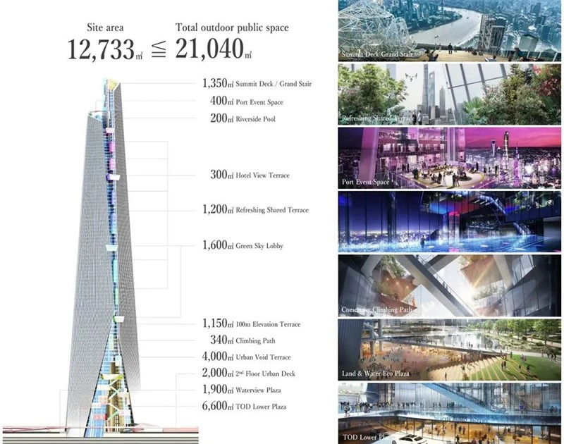 上海北外灘舉辦480米超高層塔樓設計競賽,吸引了60家全球設計事務所參與。該項目包括辦公、酒店、商業(yè)和觀景臺等功能,旨在成為區(qū)域地標并打造上海市民活動中心。日建設計公司基于以往經驗,提出了一個創(chuàng)新設計方案,關注未來高密度城市公共空間和環(huán)境問題。