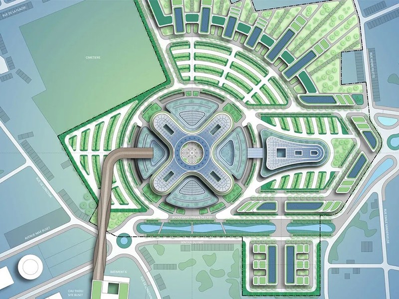 醫(yī)療后勤基地滿足了拉盧維耶爾基地和其他網(wǎng)絡(luò)地點的后勤需求。它位于東區(qū)烏爾班大道北側(cè)的環(huán)島上,提供直接的道路交通,并通過玻璃天橋與龍?zhí)贯t(yī)院相連。園區(qū)在總體規(guī)劃中整合了代際住房、養(yǎng)老院和娛樂設(shè)施等互補(bǔ)功能,促進(jìn)了城市的多樣性和一體化。