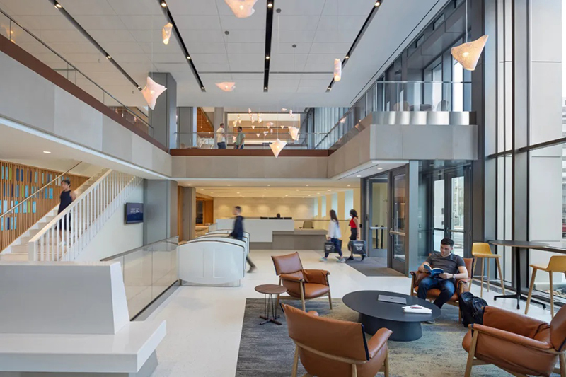 羅伯特-A-M-斯特恩建筑設(shè)計(jì)事務(wù)所(RAMSA)為位于華盛頓市中心喬治敦大學(xué)國會(huì)大廈校區(qū)的麥考特公共政策學(xué)院設(shè)計(jì)了一座新的旗艦建筑。這座新建筑占地 150,000 平方英尺,位于西北部 125 E 街,是學(xué)生、教師、研究人員以及活躍在美國首都的廣大決策社區(qū)的學(xué)術(shù)中心。大樓內(nèi)有大量的教育和社區(qū)空間,包括 20 間教室、一個(gè)寬敞的主公共空間、學(xué)術(shù)辦公室、一個(gè)可容納 400 人的禮堂,以及一個(gè)可俯瞰美國國會(huì)大廈全景的大型屋頂露臺(tái)和一個(gè)可容納 280 人的會(huì)場(chǎng)。作為一個(gè)致力于應(yīng)對(duì)復(fù)雜的國家和國際挑戰(zhàn)的學(xué)術(shù)中心,麥考特公共政策學(xué)院將可持續(xù)發(fā)展和能源效率放在首位,其設(shè)計(jì)目標(biāo)是獲得 LEED 白金級(jí)認(rèn)證。此外,由建筑師、設(shè)計(jì)師、藝術(shù)家和雕塑家瑪雅-林(Maya Lin)設(shè)計(jì)的一系列針對(duì)特定場(chǎng)所的原創(chuàng)裝置,鼓勵(lì)建筑使用者考慮周圍的自然環(huán)境。作為國會(huì)大廈校區(qū)的旗艦建筑,麥考特學(xué)校是喬治城市中心文脈和連貫性的延伸。125 E St.是一座由石材、鑲板金屬和玻璃幕墻組成的立方體建筑,其外形和規(guī)模與周邊建筑一脈相承。垂直鰭片和磚砌底板--主要用于遮擋陽光并優(yōu)化熱性能--用凸出的線條勾勒出建筑的立面,與鄰近的西北第一街 500 號(hào)的統(tǒng)一沖孔窗戶遙相呼應(yīng)。然而,麥考特學(xué)院的 125 E St. 建筑則通過金屬、石材和玻璃的交錯(cuò)使用,引入了新的視覺趣味。麥考特公共政策學(xué)院的內(nèi)部建筑是由其獨(dú)特的地理位置所提供的教育機(jī)會(huì)所決定的,即靠近美國國會(huì)大廈和最高法院等國家主要決策機(jī)構(gòu)??扇菁{ 400 人的禮堂具有廣播功能,屋頂場(chǎng)地可容納 280 人,可接待主要的政策制定者和從業(yè)人員,進(jìn)行與國家和國際政策制定相關(guān)的重要討論。大樓的設(shè)計(jì)提倡有機(jī)互動(dòng)和偶遇,以促進(jìn)形成一個(gè)強(qiáng)大、互聯(lián)和包容的學(xué)術(shù)社區(qū)。瑪雅-林工作室(Maya Lin Studio)的一系列裝置作品名為 “映射我們?cè)谑澜缟系奈恢谩保∕apping Our Place in the World),為室內(nèi)空間增添了活力,使居住者置身其中,促使他們思考自己與更廣闊世界的聯(lián)系。“波托馬克河沿岸 "是一個(gè)安裝在天花板上的玻璃大理石作品,仿佛鳥瞰波托馬克河流域。在主公共區(qū),一系列名為 “是否有鳥 ”的天氣響應(yīng)吊燈會(huì)根據(jù)陽光、云朵、雪或雨的存在而改變顏色。當(dāng)?shù)厮馈竦?、森林和草地在一天和一年中不同時(shí)間的錄音,通過主樓梯上方的定向揚(yáng)聲器播放。林還參與了建筑屋頂景觀的設(shè)計(jì)?!翱罩谢▓@ "是一個(gè)帶有橢圓形水池和本地植物的室外露臺(tái)。它為人們提供了安靜交談和休憩的機(jī)會(huì),同時(shí)還弘揚(yáng)了地區(qū)生態(tài),并將美國國會(huì)大廈的美景盡收眼底。