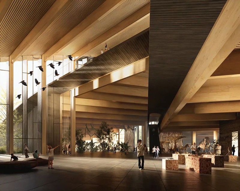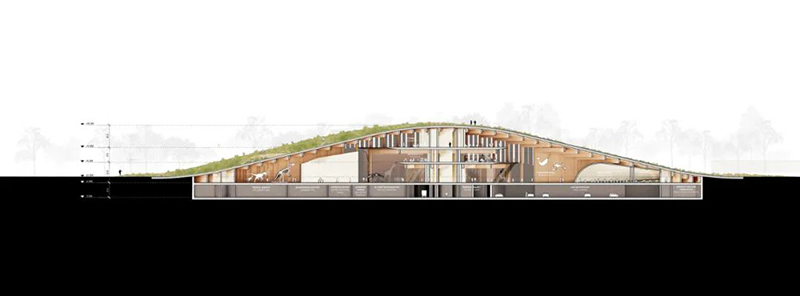 內(nèi)部空間圍繞中央接待大廳展開,呈放射狀布局,設有五個永久展廳和一個臨時展廳,用于公共活動和特別展覽。上層設有圖書館和餐廳,可俯瞰森林樹冠;下層則設有學習中心,包含研討室、游樂區(qū)和研究實驗室,為學生、家庭和工作人員提供互動空間。