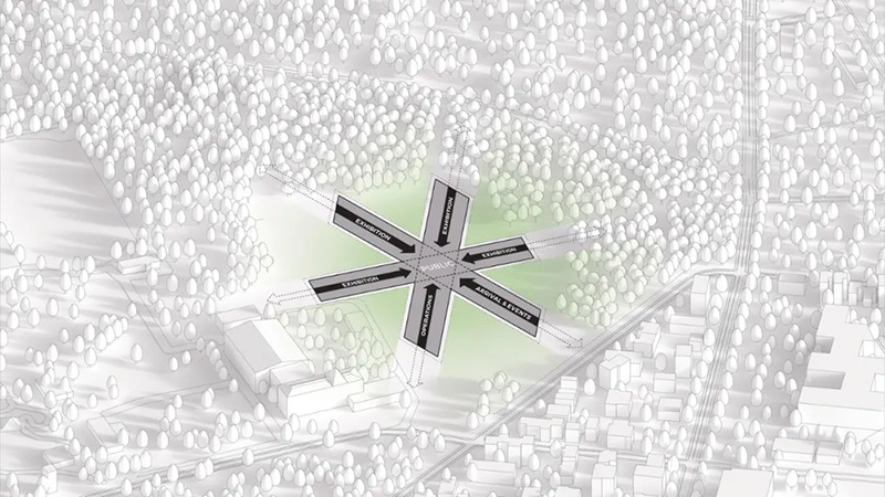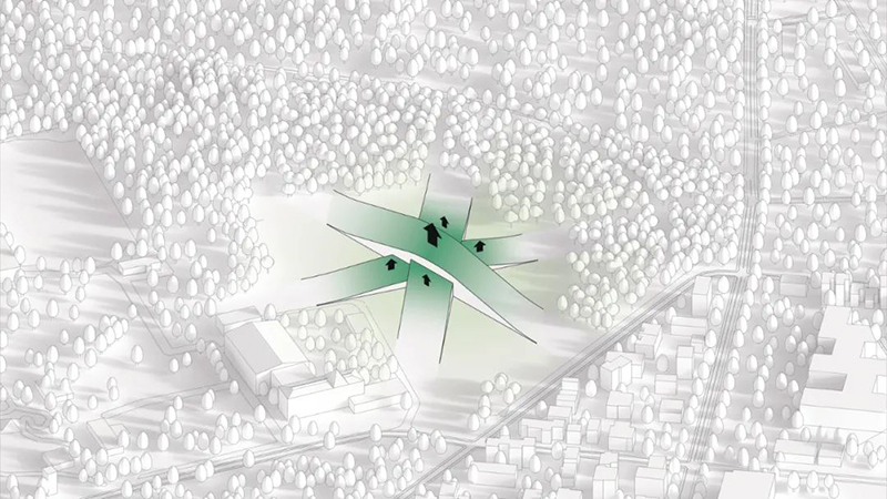 博物館從四面八方均可進入,南側廣場作為主要入口,既是社區(qū)活動的聚集地,也是博物館活動的中心點。蜿蜒的森林小徑和開放的廣場設計,引導游客自然地進入建筑內(nèi)部,增強了與周圍環(huán)境的連通性。