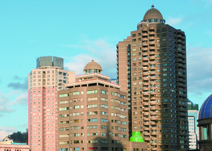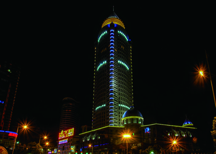 東景五星級(jí)酒店及辦公樓項(xiàng)目位于貴陽市觀山湖區(qū),基地東鄰貴陽市行政中心,北鄰鋁鎂設(shè)計(jì)院,南鄰貴州移動(dòng)指揮調(diào)度中心,西向陽森房產(chǎn),地塊基本呈矩形,項(xiàng)目總用地面積24966平方米,總建筑面積99284平方米,其中地下建筑面積41915平方米。地上建筑面積共57369平方米,地下部分共計(jì)4層,為停車庫及酒店配套用房。地上部分由一棟結(jié)構(gòu)總高64.4m的14層辦公樓和一棟結(jié)構(gòu)總高68.8m的16層酒店組成,兩棟塔樓平面呈L型布置,結(jié)構(gòu)形式均為現(xiàn)澆框架剪力墻結(jié)構(gòu),辦公樓頂部采用鋼結(jié)構(gòu)向外懸挑兩層,懸挑跨度為11.1m。辦公樓和酒店在頂部通過跨度為30m鋼結(jié)構(gòu)連接體相連,連接體在辦公樓側(cè)與混凝土柱鉸接相連,在酒店一側(cè)用滑移支座相連,滑移支座接罕遇地震下兩座單體最不利彈性位移進(jìn)行設(shè)計(jì),保證兩個(gè)單體在罕遇地震下不致相撞或脫開。